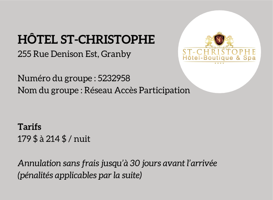 Afin de faciliter votre séjour à Granby, des blocs de chambres à tarifs préférentiels ont été réservés dans deux établissements situés à proximité des sites du Sommet. Nous vous invitons à effectuer votre réservation dès que possible, les blocs de chambres étant disponibles jusqu’au 24 février 2026. À noter que les réservations sont à la charge des participant·e·s au Sommet.